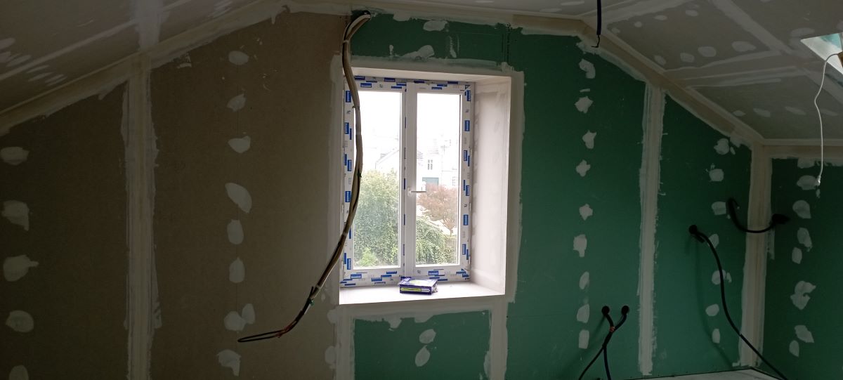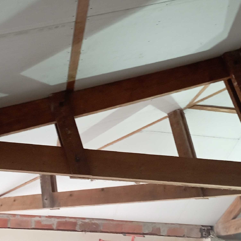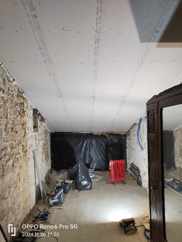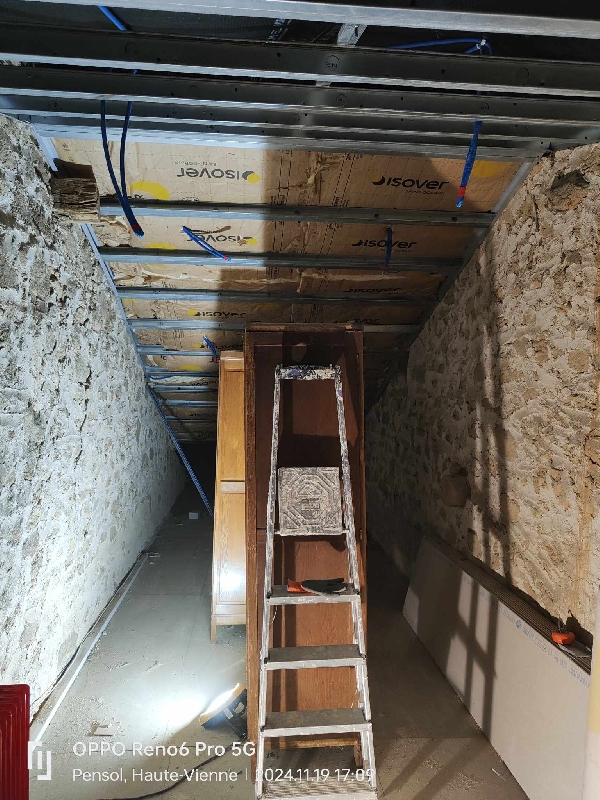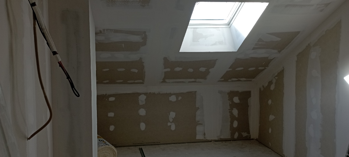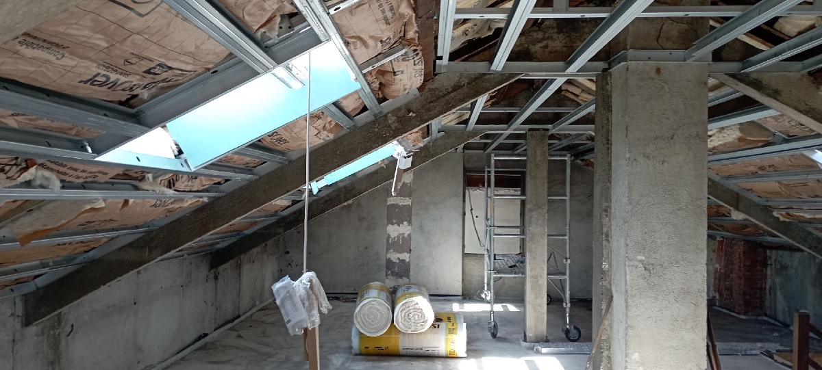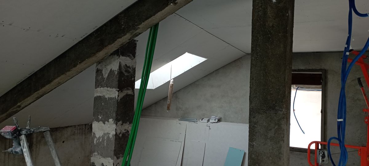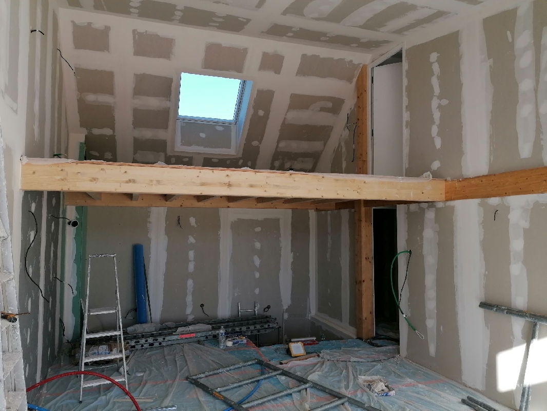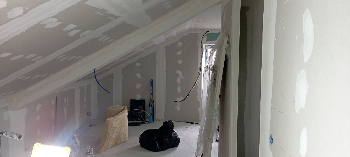 Notre mission sur ce chantier : la réalisation de la plâtrerie, de l’isolation et des plafonds afin de créer une pièce fonctionnelle, confortable et parfaitement intégrée à l’habitation existante.
